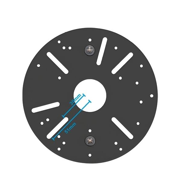 De interne kabelgeleiding houdt de bekabeling netjes en georganiseerd, wat niet alleen esthetisch aantrekkelijk is, maar ook zorgt voor een professionelere uitstraling van uw installatie. De universele montageplaat (Ø120 mm) is ontworpen om te passen bij een breed scala aan apparaten, met een boorgatradius van 30 tot 51 mm, en biedt diverse montageopties: 3 schroeven (120°) of 4 schroeven (90°) voor een stevige en veilige bevestiging.