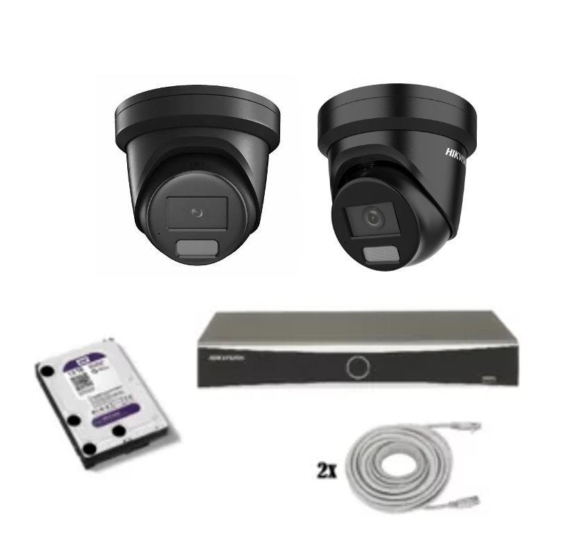Hikvision DS-2CD2347G2-LU camera set met 2 camera’s, 1 PoE recorder en 1 harde schijf.