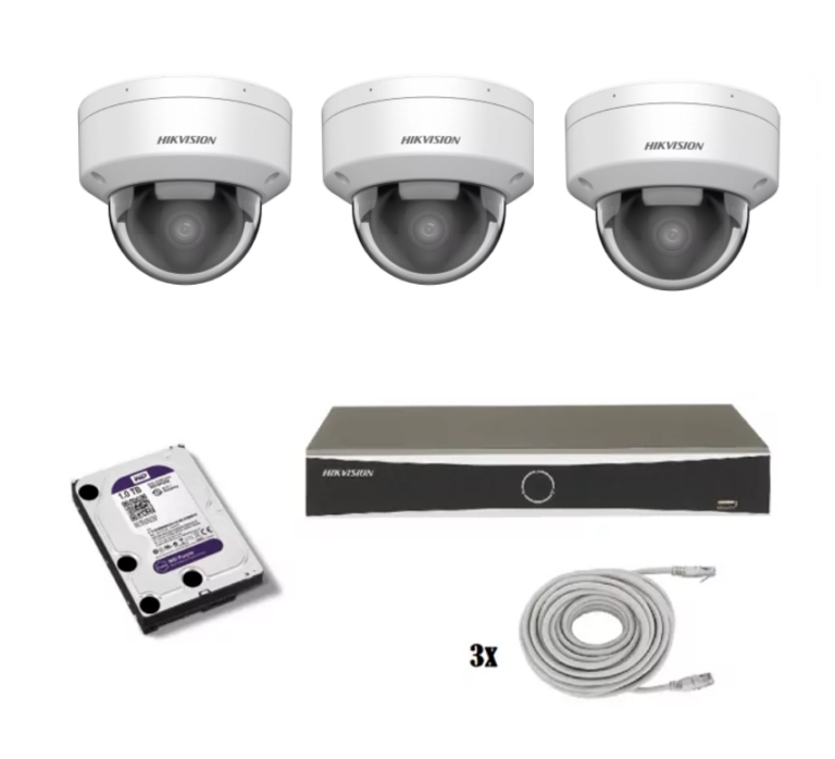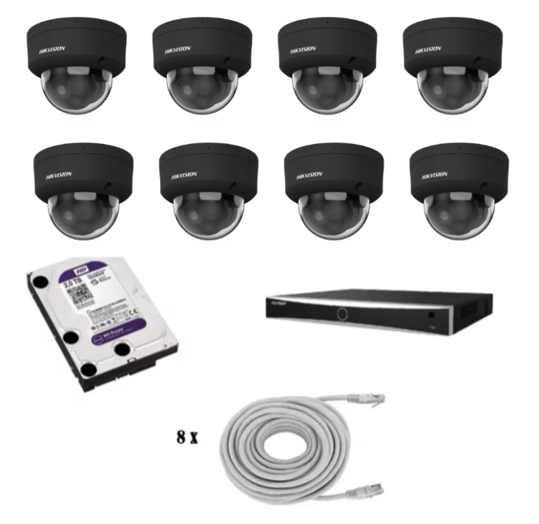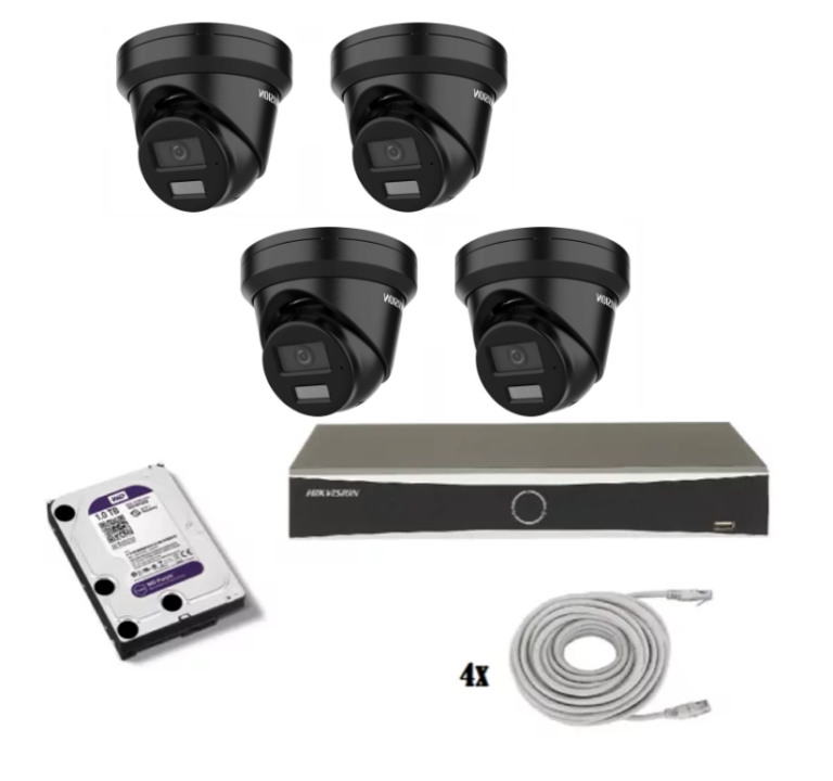 Hikvision beveiligingscamera set met 2 x Hikvision DS-2CD2386G2H-IU turret camera’s met 8 megapixels en een lens van 2.8mm, 1 x 4 kanaals Hikvision DS-7604NXI-K1-4P recorder, 1 x harde schijf van 1 TB en netwerkkabels.